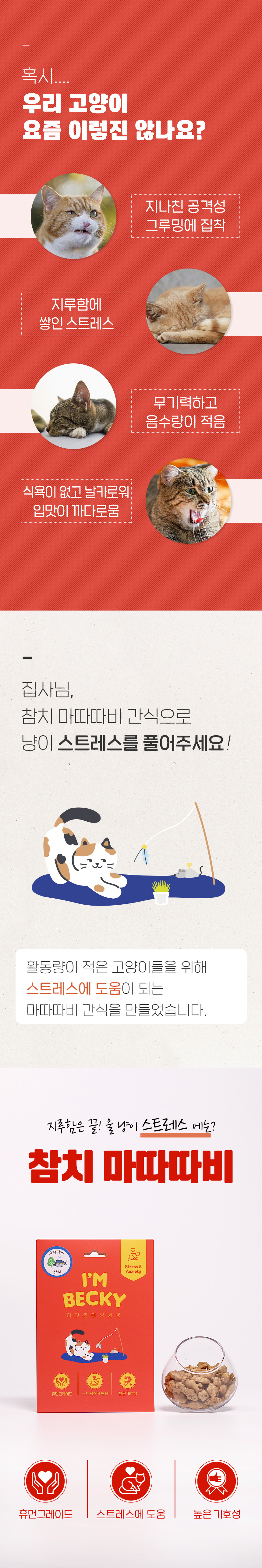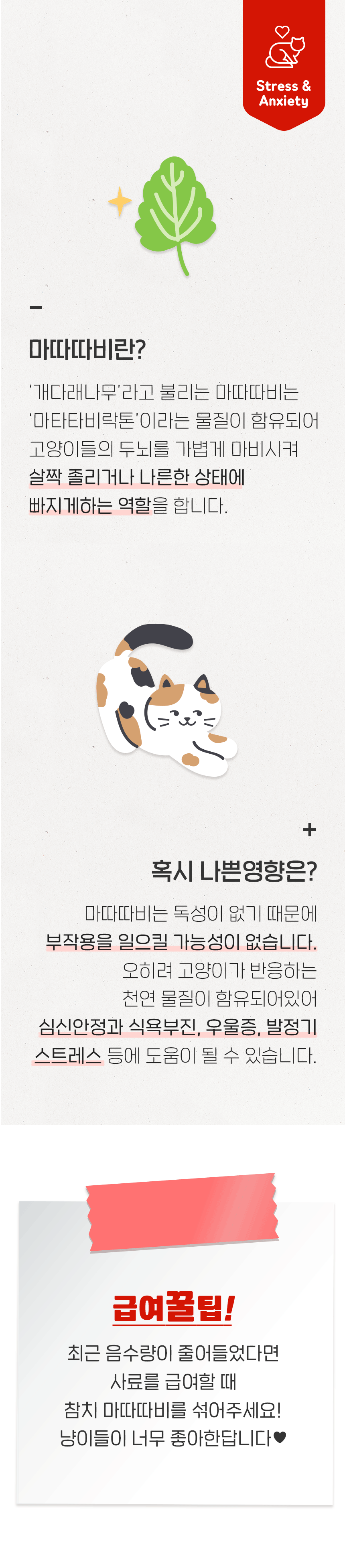 - 마따따비가 함유되어 있어 스트레스 해소에 도움