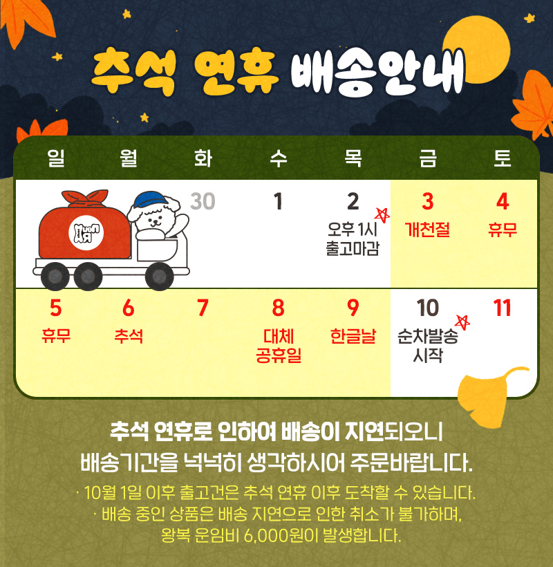 - 오후 1시이전 결제완료건 당일 출고 (주말, 공휴일 제외)