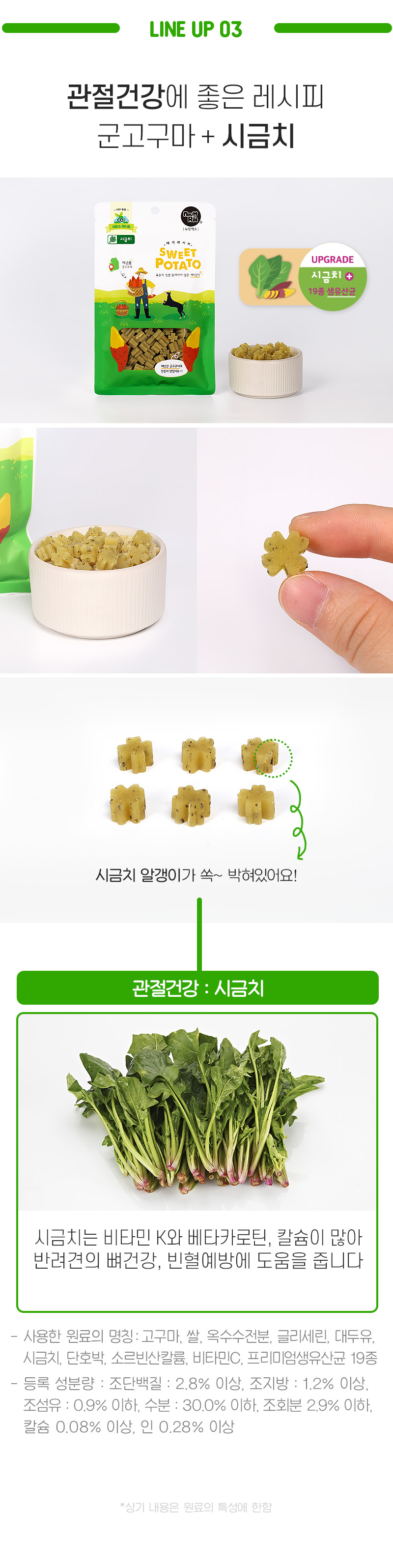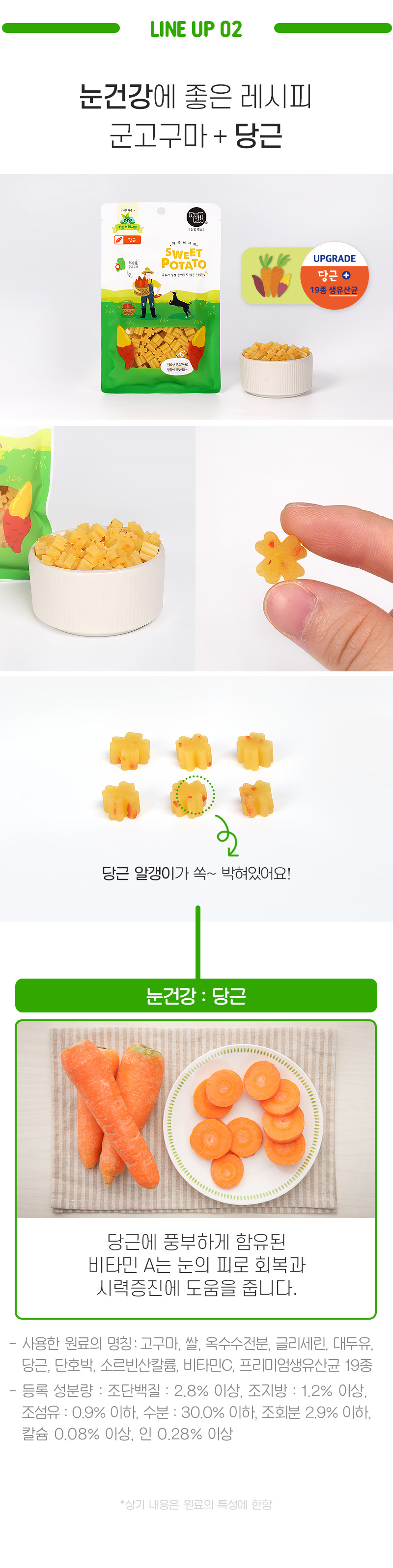 고구마, 쌀, 옥수수전분, 글리세린, 대두유, 단호박, 소르빈산칼륨, 비타민C, 프리미엄생유산균 19종